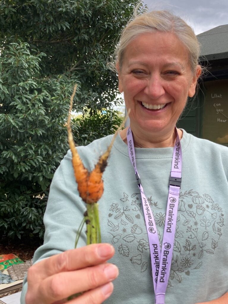 Jenny Woodgate, Clinical Lead Physiotherapist at Brainkind, describes the many benefits of working in the garden – harvesting tomatoes and berries, digging in the soil: “First there are the physical benefits of mobilising outdoors, bending and reaching, and using our fine and gross motor skills to weed, trim, and water. Then there are the cognitive benefits of paying attention to a task: initiating, planning, and sequencing that task with the opportunity to problem-solve as the task progresses.